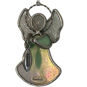 Elevate your accessory collection with this exquisite stained glass angel pendant necklace. The enchanting design, featuring a football charm, is a unique piece that marries elegance with sports enthusiasm. It is a meaningful gift for fans seeking to showcase their passion in a stylish way. In good condition.