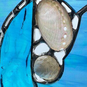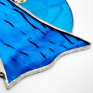 This hand-crafted stained glass suncatcher features a vivid blue whale design with natural shell accents. Its durable silver trim enhances its elegance and longevity.