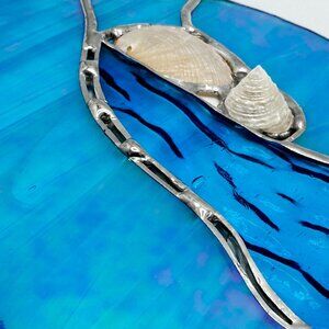 Stained Glass Blue Abstract Round Suncatcher Natural Shells Silver Accent Vtg
