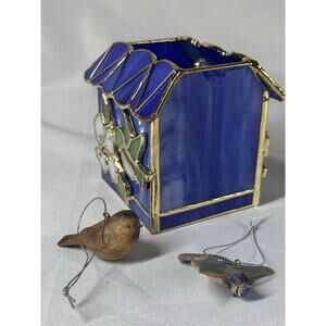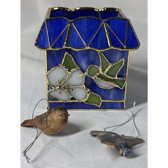 STAINED GLASS HUMMINGBIRD HOUSE W/ FLOWER 4" TALL CANDLE VOTIVE HOLDER / 2 BIRDS