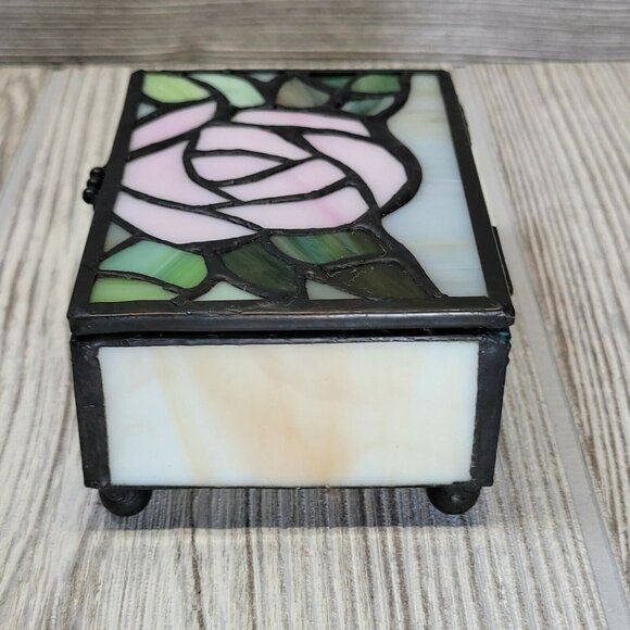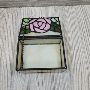 Stained Glass Jewelry Trinket Box Pink Rose Floral Design Keepsake