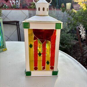 This handcrafted abstract stained glass lantern, measuring 5"x5"x12", features a unique multicolor design that will add a touch of artistry to any space. Different design on all 4 sides. Powered by an LED candle, this one-of-a-kind lamp is sure to make a statement with its original design and handmade craftsmanship. Made in the United States by the artist Katee, this lantern showcases a blend of stained glass and glass materials, creating a visually striking piece that is perfect for both decorative and functional lighting purposes.