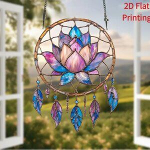 Enhance your home decor with this stunning stained glass lotus dreamcatcher. Featuring vibrant purple and blue hues, this piece adds a touch of elegance and tranquility to any space.