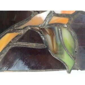 Beautiful vintage stained glass panel from unknown artist, from the mid-late 20th century. The panel can be hung on the wall, in the window or on any other vertical surface. Artwork pictures a colorful bright flower against a dark background. Comes with hanger.