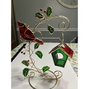 Stained Glass Red Cardinal Holly Leaves Birdhouse Candle Holder 12.5” Tall
