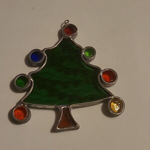 Colorful stained glass Christmas tree ornament with festive lights.It is approximately 4.5 inches tall and approximately 4 inches wide.
