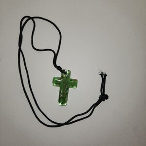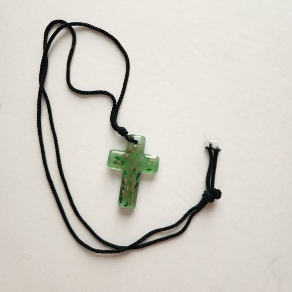 Stained glass green cross pendant with swirled gold glitter on a black cord. Perfect with a boho outfit.