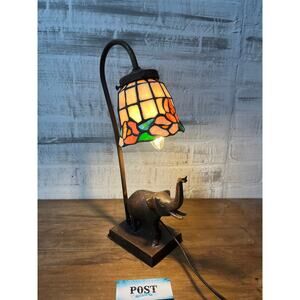 This beautiful desk lamp features a stained glass tulip design and a charming elephant statue on the base. Perfect for adding a touch of elegance, it is 15” tall, 5” by 4” base