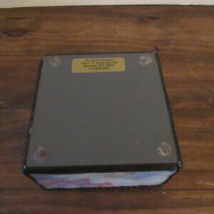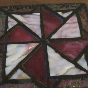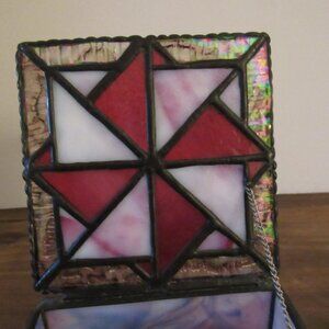 This is a gorgeous trinket box made of stained glass. It features a triangular design on the lid. There is a chain to hold the lid in place and the bottom is mirrored. It is in good vintage condition. No chips or cracks. Please see pictures for further details of condition.