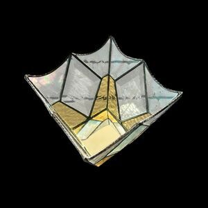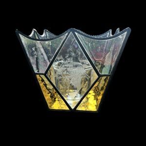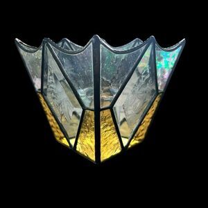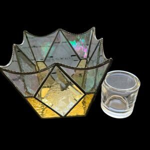 Beautiful stained glass candle holder with a geometric design. Includes a clear glass votive. Features iridescent and gold tones.