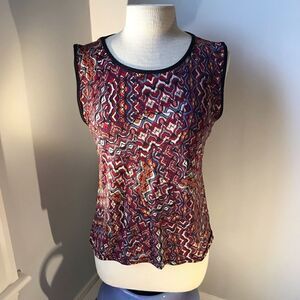 Beautiful “stained glass” shell. Black piping at hem - shoulder and neck. Sleeveless, thick straps. Scoop neck. Colorful! Orange, maroon, blue grey and white. Silky. Probably polyester. No tags at all but considering measurements, an XL. Flat lay L 23”, P-P 19” approx. items in styled photo available in my closet!