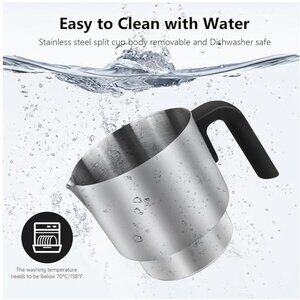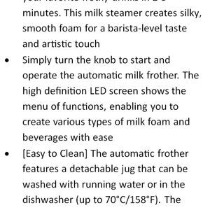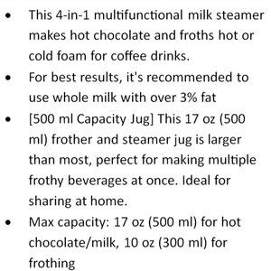 This 4-in-1 stainless steel milk frother and steamer is an electric, automatic countertop milk frother, featuring a detachable stainless steel jug with a large 17oz (500ml) capacity, making it suitable for preparing multiple servings of lattes, cappuccinos, macchiatos, or hot chocolate. The detachable jug makes it easy for pouring as well as cleaning, while the led screen/control knob features make it easy for mode selection. Enjoy a cup of hot chocolate or coffee any way you like it!!!