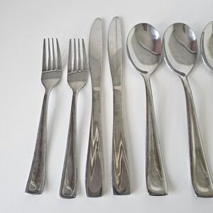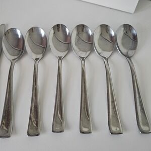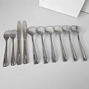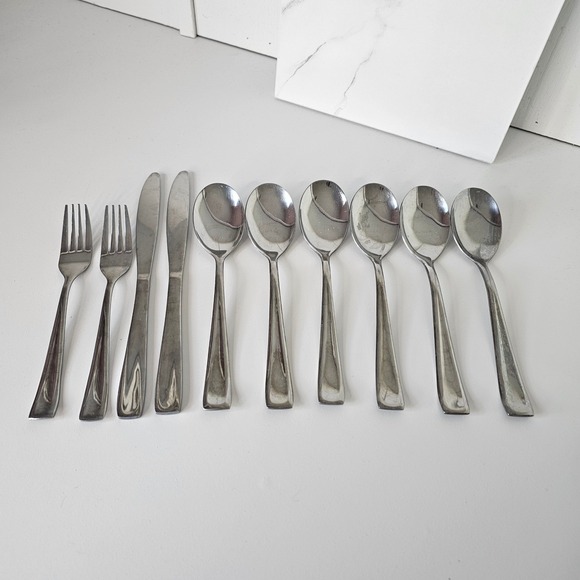 Ten-piece set of flatware, perfect for a modern table setting. The set comprises two forks, two knives, and six spoons, all crafted in a sleek, contemporary design with a minimalist aesthetic. Marked Stainless China.