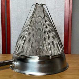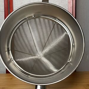 Durable stainless steel mesh strainer. Ideal for kitchen use. This is a commercial sized strainer with tight mesh metal. Great cooking, and baking, either at home or in a restaurant.
