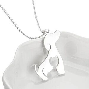 Stainless Steel Cat & Dog Pendant Necklace Silver Tone