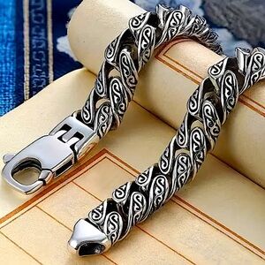 Stainless steel Men’s domineering Cuban chain link hipster punk bracelet. Measures 22cm, 8.66”.