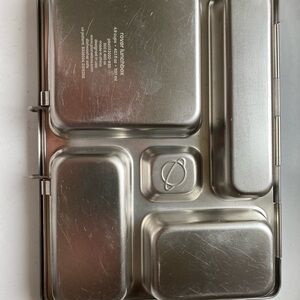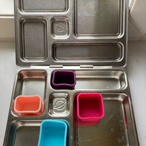 PlanetBox stainless steel Rover lunchbox with silicone dip/snack containers. Durable stainless steel tray with multiple compartments for organized storage. Our daughter loved taking this to school!