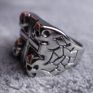 Make a bold statement with this Stainless Steel Cross & Skulls Ring, designed with striking detail and heavy gothic attitude. Featuring a raised cross at the center surrounded by sculpted skulls along the band, this piece delivers a powerful look while maintaining comfortable everyday wear.