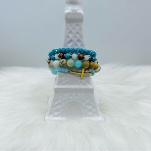Four piece bracelet featuring a Stainless steel cross made of mini glass beads accompanied by mixture of beaded bracelets