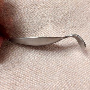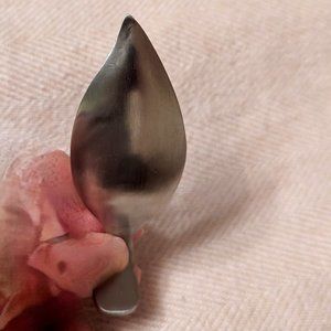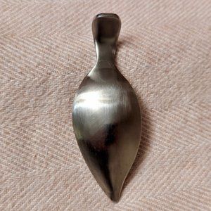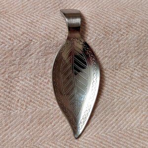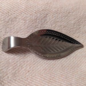 This is a beautiful, engraved holder/rest/caddy for tea bags, made of stainless steel. It's shaped like a leaf and etched with decorative stripes and patterns. The top is shiny and the bottom is brushed and matte. It has a short, curved handle and a shallow bowl, like a spoon. At 3.75 inches long x 1.4 inches wide at its widest (when positioned vertically) it's small, but will fit 1 used teabag, when wrung out. It could also be used to hold rings on a bureau or bedside table or as a spoon rest for a small spoon. It's in like-new condition and a very unique piece as it was originally purchased at an art fair.
