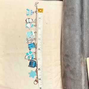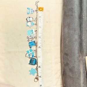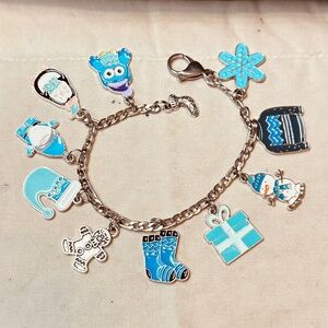 Handmade. New. Stainless Steel Figaro chain bracelet with several winter themed charms. Snowman, gift, stocking, socks, gingerbread man, snowflake, sweater, penguin, owl, gnome. Large stainless steel lobster clasp.