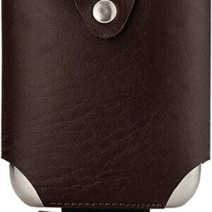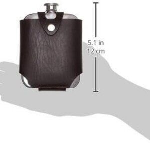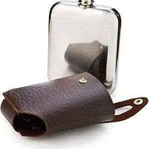 Discover the Stainless Steel Flask and Traveling Case, the perfect novelty hip flask for those who enjoy a sip of their favorite liquor on the go. This metal flask is a stylish and practical accessory designed for the modern gentleman. Whether you're heading to a social event or simply enjoying a quiet evening outdoors, this whiskey flask is sure to elevate your drinking experience. Snap your silver five-ounce vessel into a rich chocolate-brown carrying case and set off on the next adventure. The exterior features a faux leather construction that adds a touch of elegance and durability. This leather wrap flask is designed to withstand the rigors of regular use, making it an ideal flask for liquor enthusiasts. Disclaimer : Flasks aren't meant for storing alcohol long-term. Leaving liquor in a flask for too long might lead to undesirable flavors. To keep things fresh, finish or replace the contents within a few day