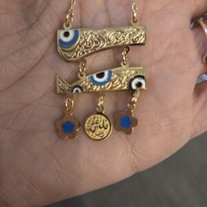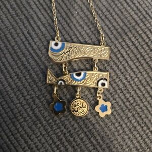Elegant gold necklace with an evil eye pendant. Features blue and white accents.