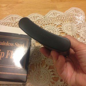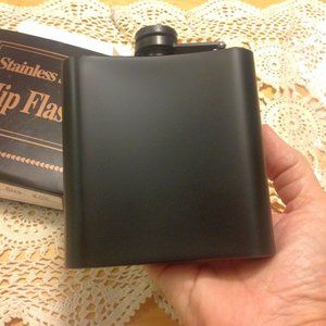 Unisex stainless steel mini hip flask, in black, new in opened box. Box has scuffs, wear but flask is new.