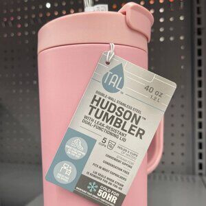 The Stainless Steel Hudson Tumbler with Straw by Tal is a bright pink 40 fl oz tumbler perfect for keeping drinks cold (or hot) while on-the-go. Made from durable stainless steel, this tumbler comes with a convenient straw for added convenience. With its sleek design and vibrant color, this tumbler is both practical and stylish for any kitchen storage and organization needs.