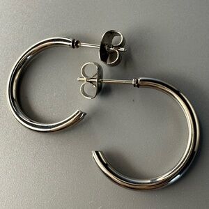 Perfect everyday huggie hoops in durable stainless steel. 20mm size sits close to ear for sleek, modern look. Secure hinged closure won’t fall out.