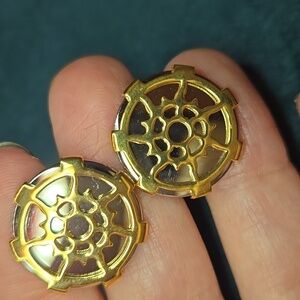 These stainless steel cuff links feature an intricate filigree pattern, offering a vintage charm that enhances any formal attire. The warm, yellow-gold finish and delicate openwork design make them a standout accessory for special occasions. Their modest size ensures they are both decorative and suitable for everyday elegance. band new in box