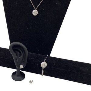 A versatile stainless steel jewelry set featuring a necklace, earrings, and bracelet in a polished silver tone. Suitable for formal or casual wear.