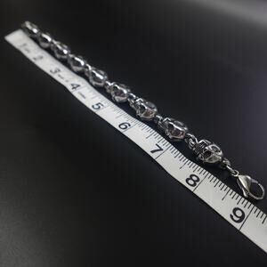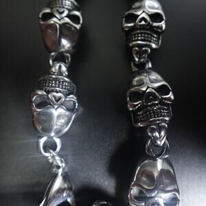 Make a statement with the SBR-5303 Skull Bracelet from AAB Style. Crafted from durable, high-quality stainless steel, this bold piece features a series of oversized, intricately detailed skulls linked together for maximum visual impact. Its heavyweight feel and rugged finish give it an unmistakable presence on the wrist—perfect for those who embrace a fearless, unapologetic style.