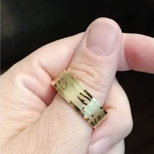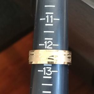 Stainless steel gold tone ring with hooks. Water and oil proof. Brushed finish. 8mm wide. Size 12 1/2. Please see photo for sizing