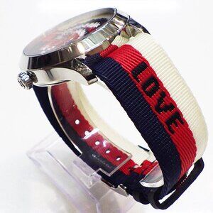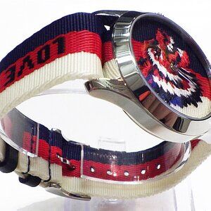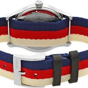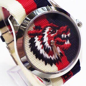 This is an authentic GUCCI Stainless Steel Nylon 38mm Le Marche Des Merveilles Wolf Quartz Watch. This magnificent watch is composed of stainless steel and features a red, white, and blue striped nylon band. Features include a roaring tiger's head on the dial which is then accented with silver sword hands. Enjoy this excellent Swiss quartz movement watch with the distinctive style only from Gucci!