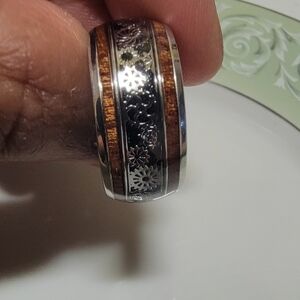 Stainless Steel Ring With Wood And Gears Design. Size 9. New In Packaging.