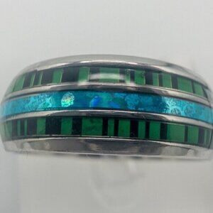 This stainless steel ring features a unique green and blue inlay, creating a striking and stylish accessory. The durable stainless steel band ensures long-lasting wear. Perfect for everyday wear or special occasions.
