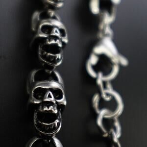 Unleash bold attitude with the SBR-5307 Skull Bracelet from AAB Style. Crafted from high-quality stainless steel, this standout piece features a striking row of detailed skulls linked together with precision and edge. Rugged yet refined, it's built for durability and designed to make a statement—whether worn solo or layered. Perfect for those who live unapologetically.