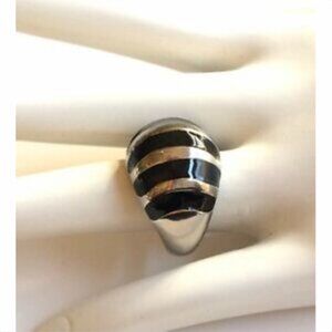 Stainless Steel Stripes Cocktail Ring Size 8 9 10 Silver Black Enamel Dome