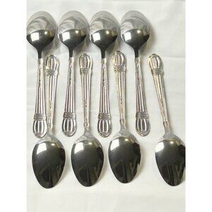 Set of eight stainless steel teaspoons featuring a ribbed handle design with elegant gold-tone wrap accents. Each teaspoon measures about 6 inches long and is stamped “STAINLESS CHINA.” The timeless silver and gold mixed-metal design pairs well with both modern and traditional table settings — ideal for replacements, completing a flatware set, or everyday dining.