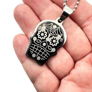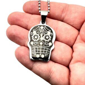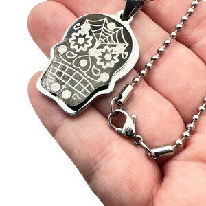 Stainless Steel Unisex Necklace Sugar Skull Day of the Dead 24 Inch Chain