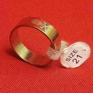 Design: It is a wide-band ring with a gold tone. The front of the ring features an engraved skull and crossbones symbol.