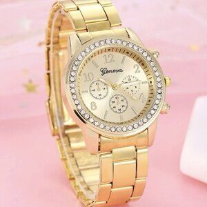 Stainless Steel Yellow Watch Geneva Quartz Round Face Rhinestone Women NWT