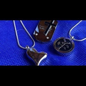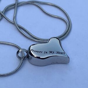Brand new- Stainless Steel cremation urn necklace with 18” chain. Comes with instructions, funnel and plunge pin. Gift boxed.