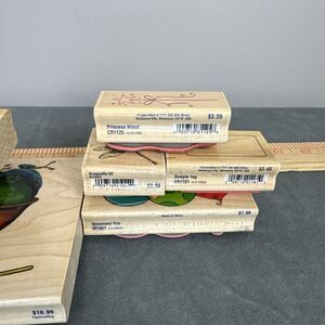 Listed is a lot of 2000's Stampabilities wood and rubber stamp lot, including Choo-choo, reindeer, ornament trio, sun, Santa, in sleigh, simple tag, princess wand, dragonfly.