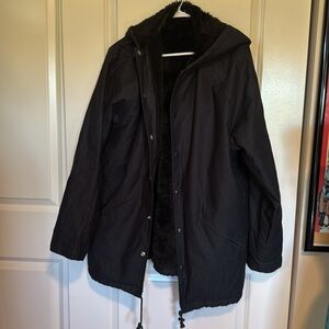 Stylish black jacket with a hood. Features Stampd logo on the back. STAMPD
