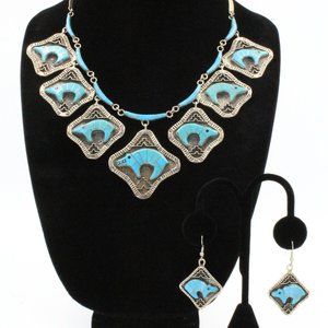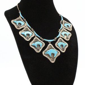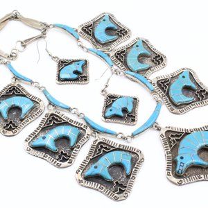 Stamped Derrick Cadman Navajo Sterling Silver Bear Inlaid Turquoise Necklace Set