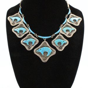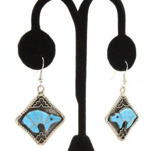 "Immerse yourself in the timeless beauty of Native American craftsmanship with this exquisite vintage set by Derrick Cadman, a skilled Navajo artist celebrated for his mastery of silverwork. Crafted during the culturally rich 1970s, this set includes a necklace and earrings that epitomize the essence of Navajo artistry. The necklace features seven sterling silver panels suspended delicately, each adorned with a figural bear intricately crafted from inlaid turquoise stones, showcasing remarkable tribal detailing. Adding to its allure, the necklace's connecting segments boast their own turquoise stone inlays, accentuating the piece's cohesive design.