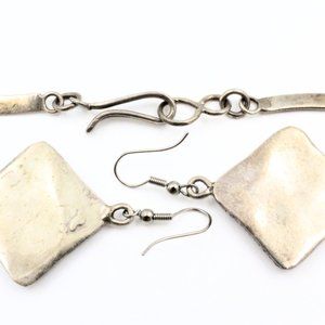 Complementing the necklace, the dangle earrings mirror the beauty of the panels, creating a harmonious ensemble that exudes sophistication and cultural significance. Marked with Derrick Cadman's initials ""DC"" and ""STERLING"", this set bears the hallmark of quality craftsmanship. Despite its age, the set remains in excellent condition, with slight tarnishing and a patinaed finishing that adds to its vintage charm. Weighing 127.3 grams and measuring 16 1/2"" in length, with the largest panel measuring 2 1/4"" by 2"" and the earrings 2"" long by 1 1/2"" wide, this set is a testament to the enduring legacy of Navajo jewelry artistry, destined to captivate admirers for generations to come."