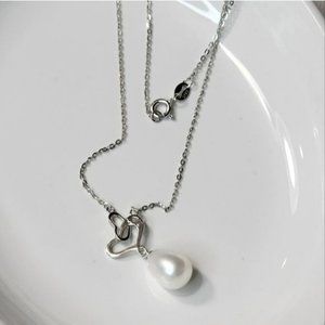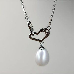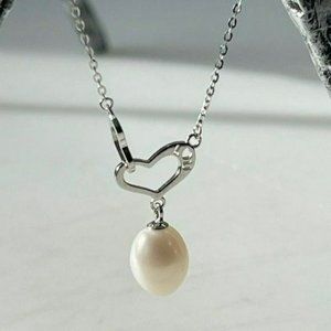 Stamped I LOVE U 925S Silver Drop Freshwater Pearl Pendant Heart Necklace